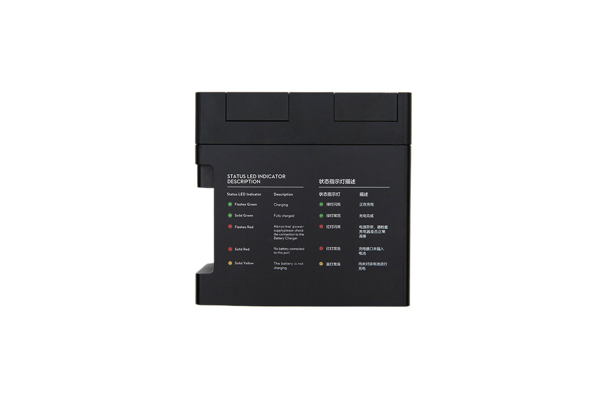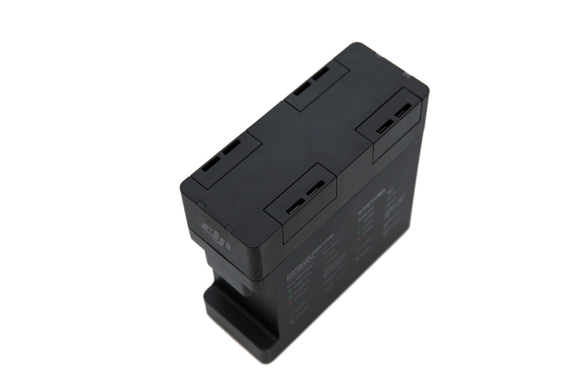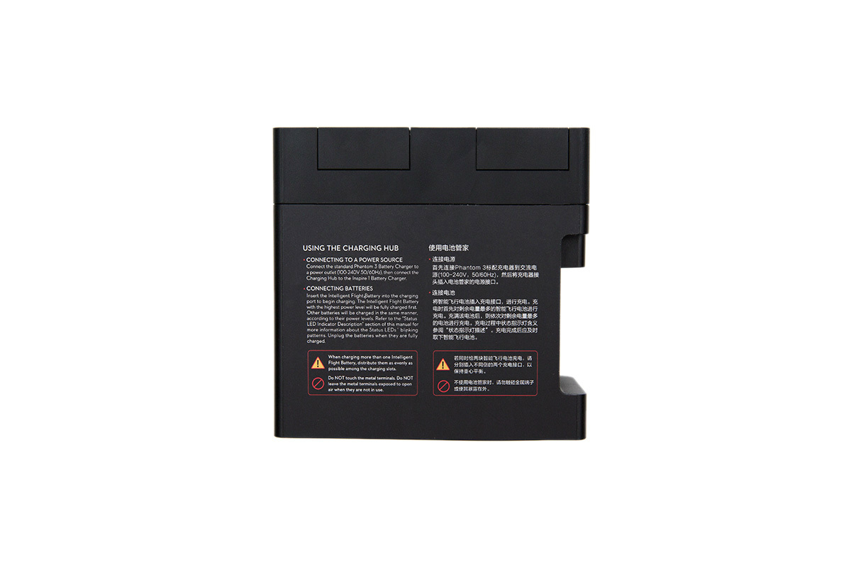 Небольшое устройство, работающее со стандартным зарядным устройством и проводом DJI Phantom 3, автоматически выбирает батарею с максимальным оставшимся зарядом, заряжает ее и переключается к следующему аккумулятору. Весь процесс и статус батарей отражается на индикаторах хаба.